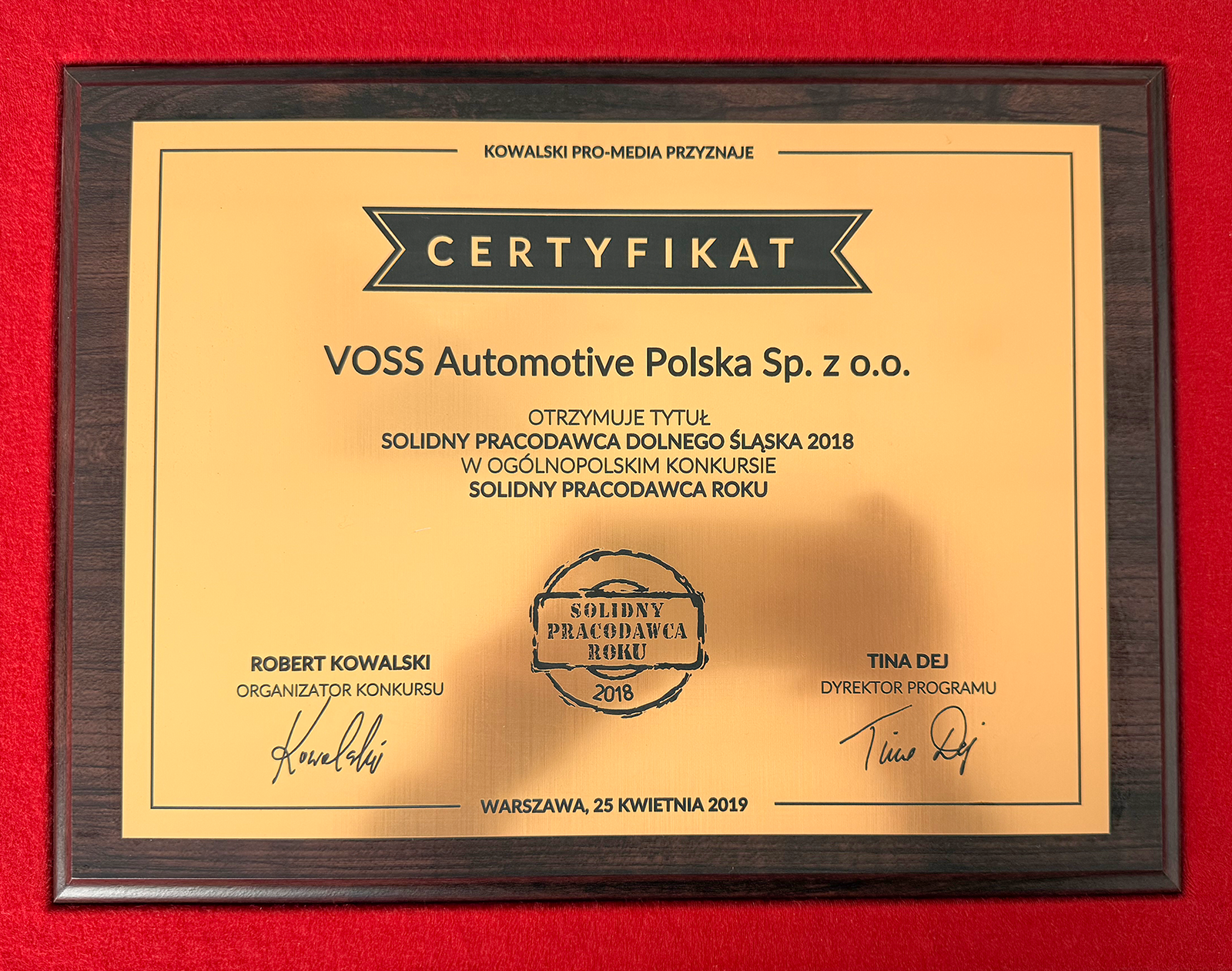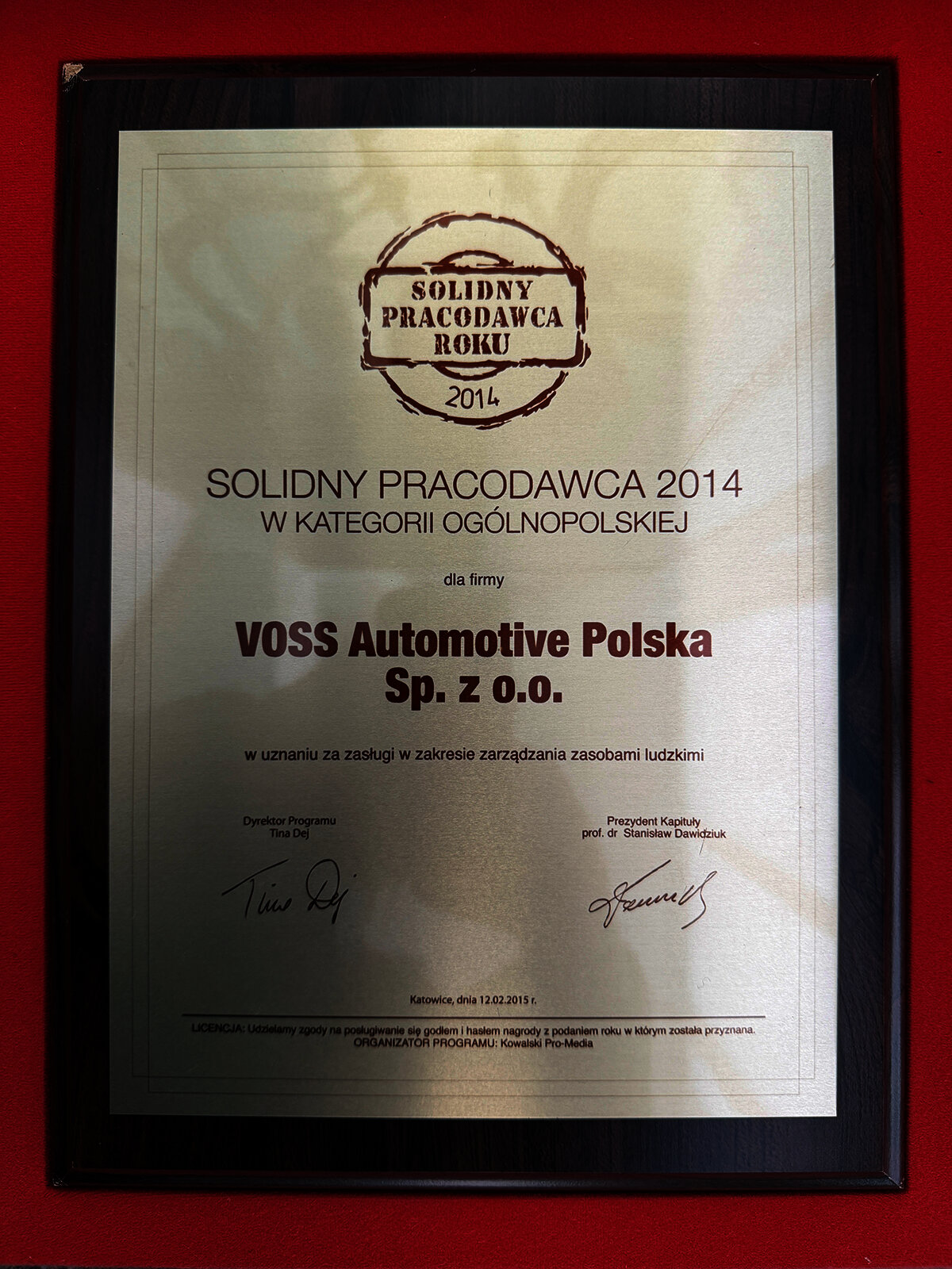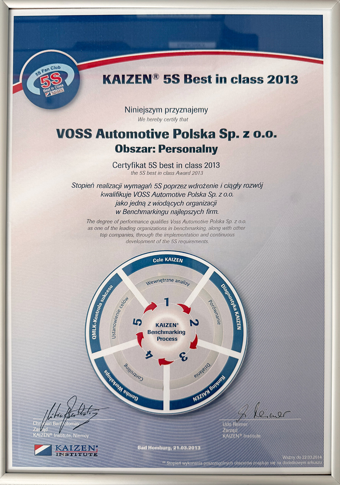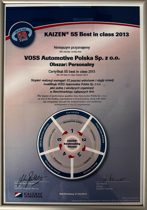 Przyznany tytuł przez Kaizen Institiute oznacza, że VOSS Automotive Polska Sp. z o.o. osiągnął najwyższy stopień realizacji wymagań 5S poprzez wdrożenie i ciągły rozwój. Kwalifikuje to nas jako jedną z wiodących organizacji w benchmarkingu najlepszych firm.